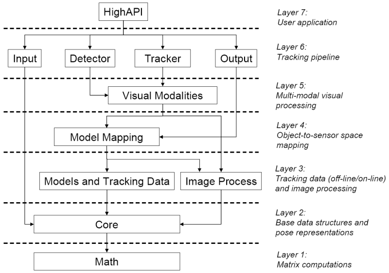 Layer 5 contains the visual modalities for tracking: they perform all model-based processing operations required for data association and fusion (both over multiple modalities and targets), and deliver output measurements to the trackers/detectors of the upper layer. It provides a common abstraction for model- and state-based measurement processing (pre-processing, features sampling, data association, Likelihood or explicit residual computation, data fusion, features update after state update) according to each visual modality (color, template, edges, ...) It depends on the ModelMapping module, because it needs to map points and features between object and image space, in order to perform matching, sampling and update operations. It depends on CvProcess, because modalities make use of specific image-based processing (e.g. pre-processing, detection or matching).