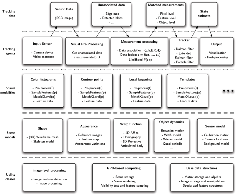 This scheme follows our model-based tracking pipeline concept, which produces the desired output (state probability density estimation) starting from raw image data and going through multiple processing levels.